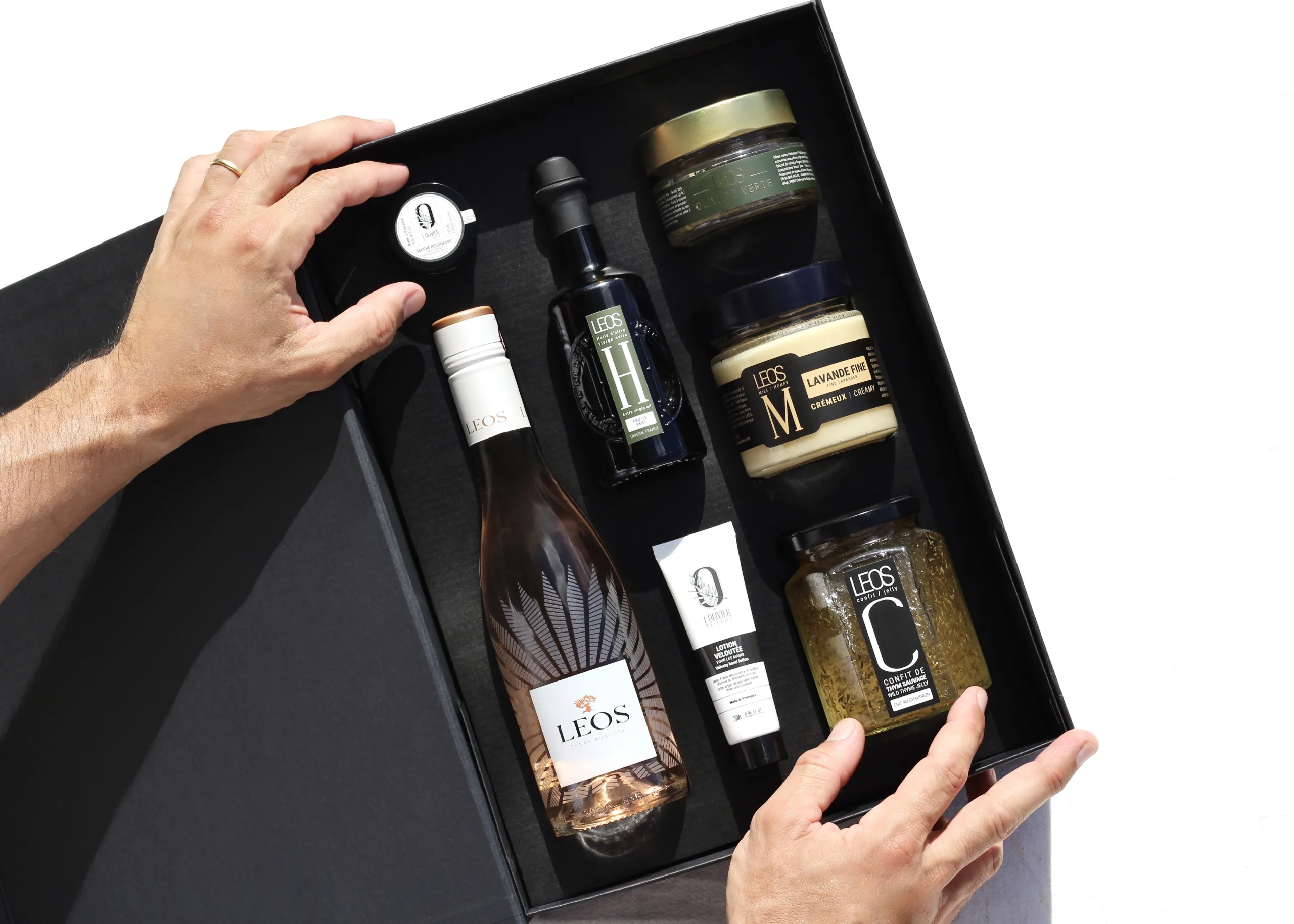 Nos coffrets gastronomiques incarnent l’excellence culinaire française dans toute sa splendeur. Chacun d’eux célèbre l’art de l’accord parfait entre vins d’exception, douceurs artisanales et huiles d’olive d’une grande finesse. Ces créations raffinées offrent une expérience gustative complète, où chaque produit dialogue avec les autres pour composer une harmonie de saveurs à la fois subtile et équilibrée. Véritables invitations au plaisir et au partage, nos coffrets révèlent toute la richesse et la sophistication du savoir-faire du Domaine de Leos.
