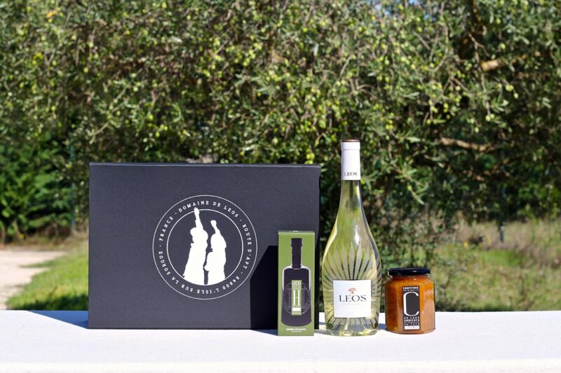Coffret-cadeau premium en carton noir avec fermeture aimantée contenant 1 bouteille de blanc LEOS Cuvée Augusta (75 cl), 1 bouteille d’huile d’olive H DE LEOS fruité vert (10 cl) et 1 pot de confiture extra C DE LEOS d’abricots au thym sauvage du DOMAINE DE LEOS (333 g).