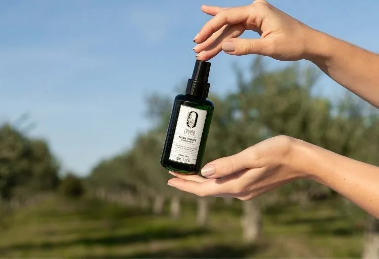 Formulée avec de l’eau végétale de feuilles d’olivier du Domaine de Leos, riche en minéraux essentiels, cette brume est également enrichie en eau florale de rose apaisante et en extrait de bourgeon de cassis, reconnu pour ses propriétés antioxydantes et protectrices contre la lumière bleue.