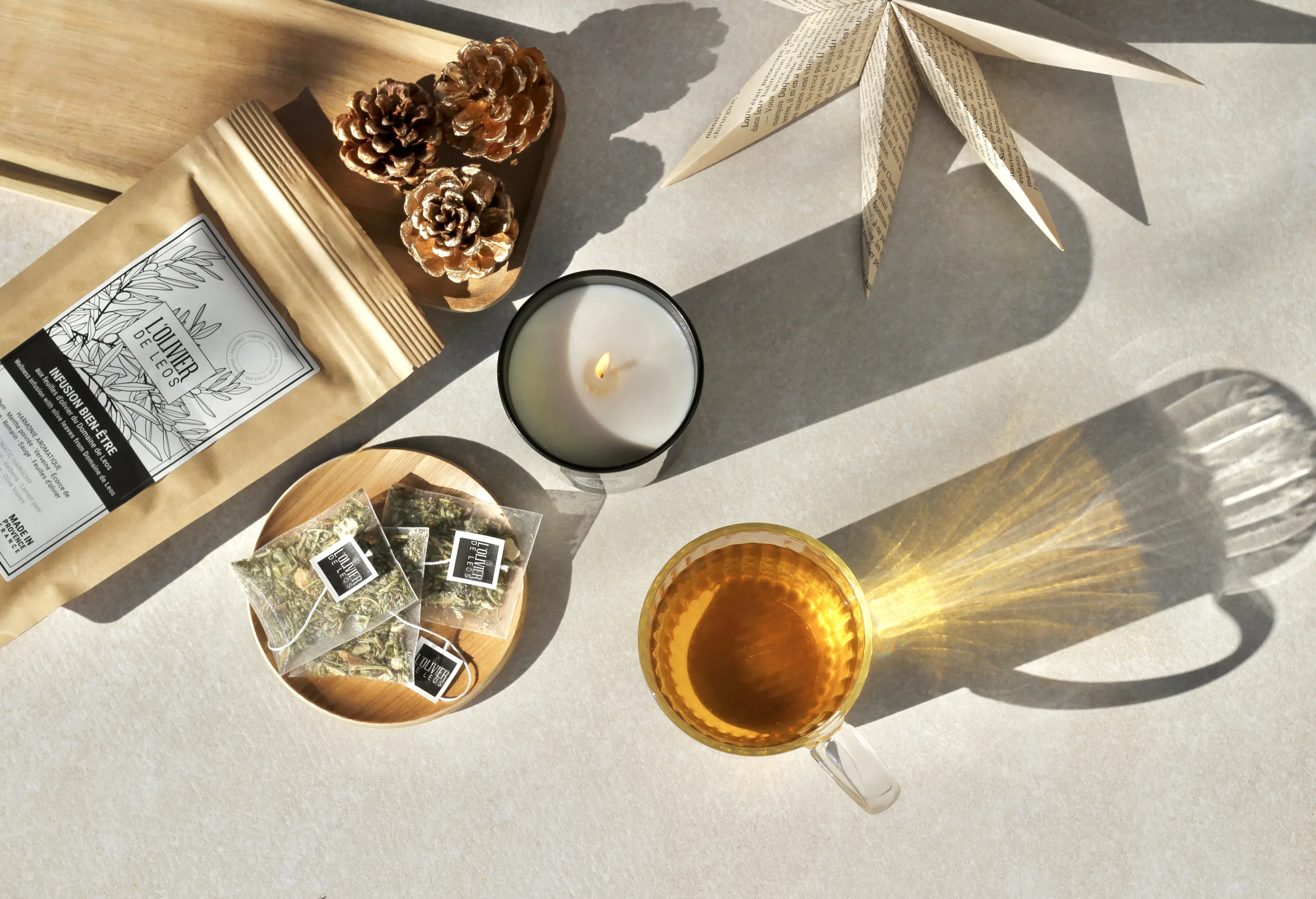 Composée de plantes aromatiques – verveine, thym, menthe et feuilles d’olivier –, cette infusion sans théine révèle une saveur subtile et équilibrée. Elle prolonge les bienfaits du rituel bien-être et évoque les parfums ensoleillés de Provence.
