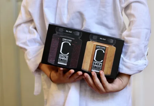 Un coffret à offrir pour faire découvrir deux confitures d’exception, élaborées avec 70% de fruits et relevées d’une touche subtile de thym sauvage du Domaine de Leos.