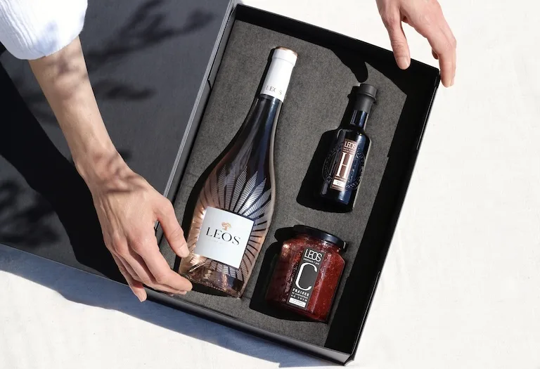 Coffret premium réunissant 3 icônes de la douceur du fruit : rosé Leos Cuvée Augusta, huile d’olive H de Leos fruité mûr, et confiture extra de Fraises de Carpentras au thym, pour une parenthèse gourmande à la fois fraîche et raffinée.