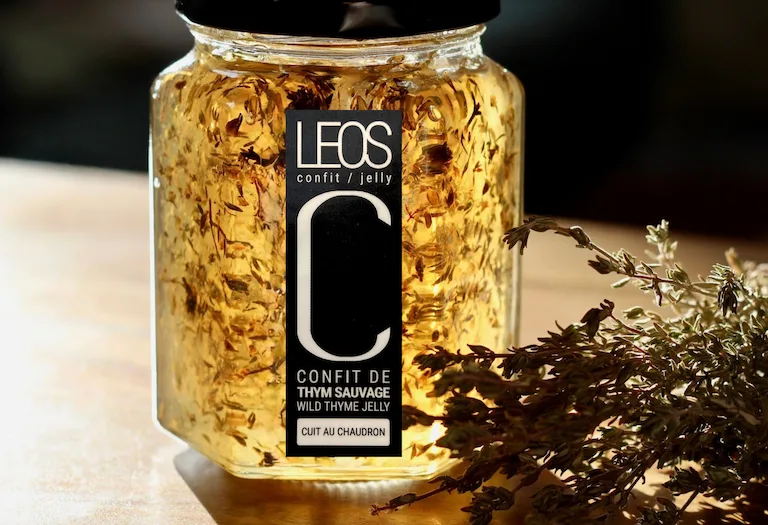 Les gelées ou confits d’herbes sont des préparations traditionnelles de conserve sucrée : l’herbe (ici le thym) est infusée, puis gélifiée à la pectine pour capturer son parfum, à l’origine pour accompagner fromages et viandes rôties. Le confit de thym Leos est à la fois une gelée dans son aspect et un confit en tant qu’aide culinaire.