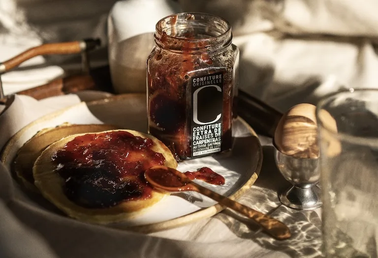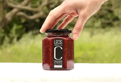 Une confiture d’exception élaborée à partir de fraises de Carpentras sélectionnées avec soin et relevées d’une touche de thym sauvage du domaine de Leos.